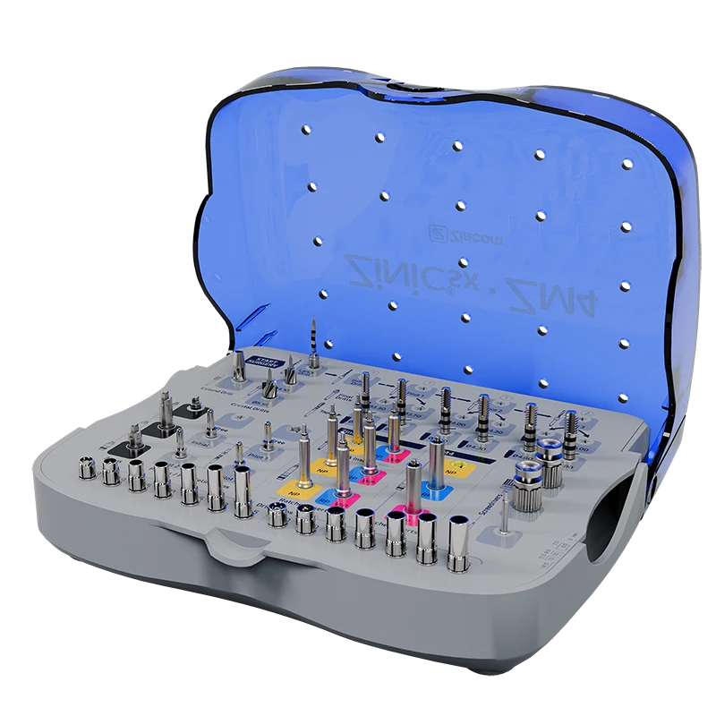 El kit ZinicSX + ZM4 se ha desarrollado para integrar dos sistemas de implantes en una única caja quirúrgica, garantizando la funcionalidad y la eficacia durante los procedimientos. Todos los instrumentos son  optimizado para ambos sistemas, lo que hace que este kit sea ideal para los profesionales que buscan simplificar su flujo de trabajo quirúrgico y aumentar la productividad clínica.