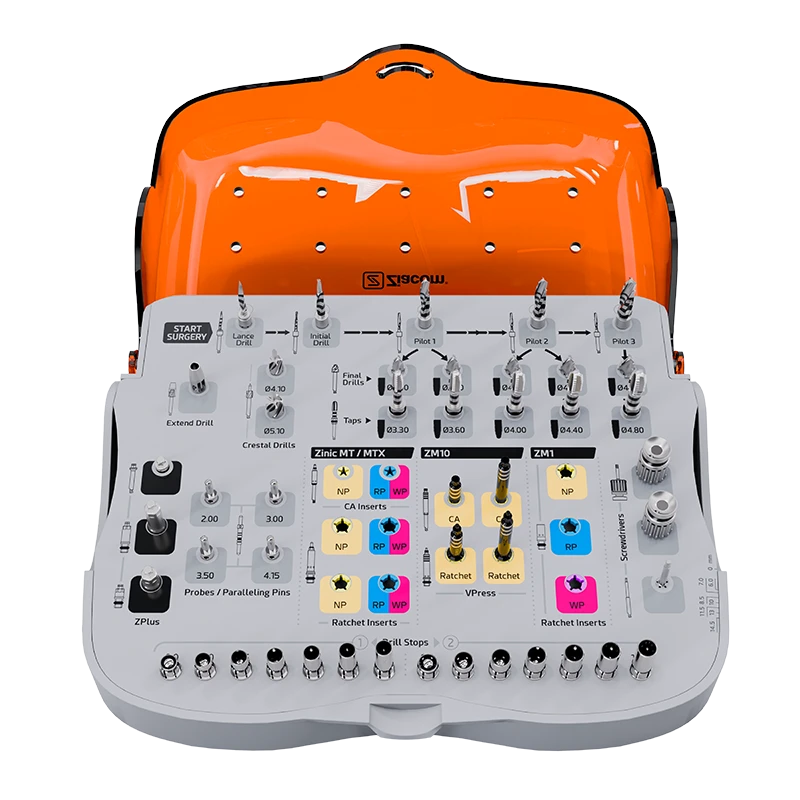 ATENCIÓN* El kit quirúrgico no incluye las llaves de inserción ni la llave de bloqueo ZPlus, que deben pedirse por separado en función del sistema de implante utilizado: Zinic® MTX / ZM10 / ZM1.
